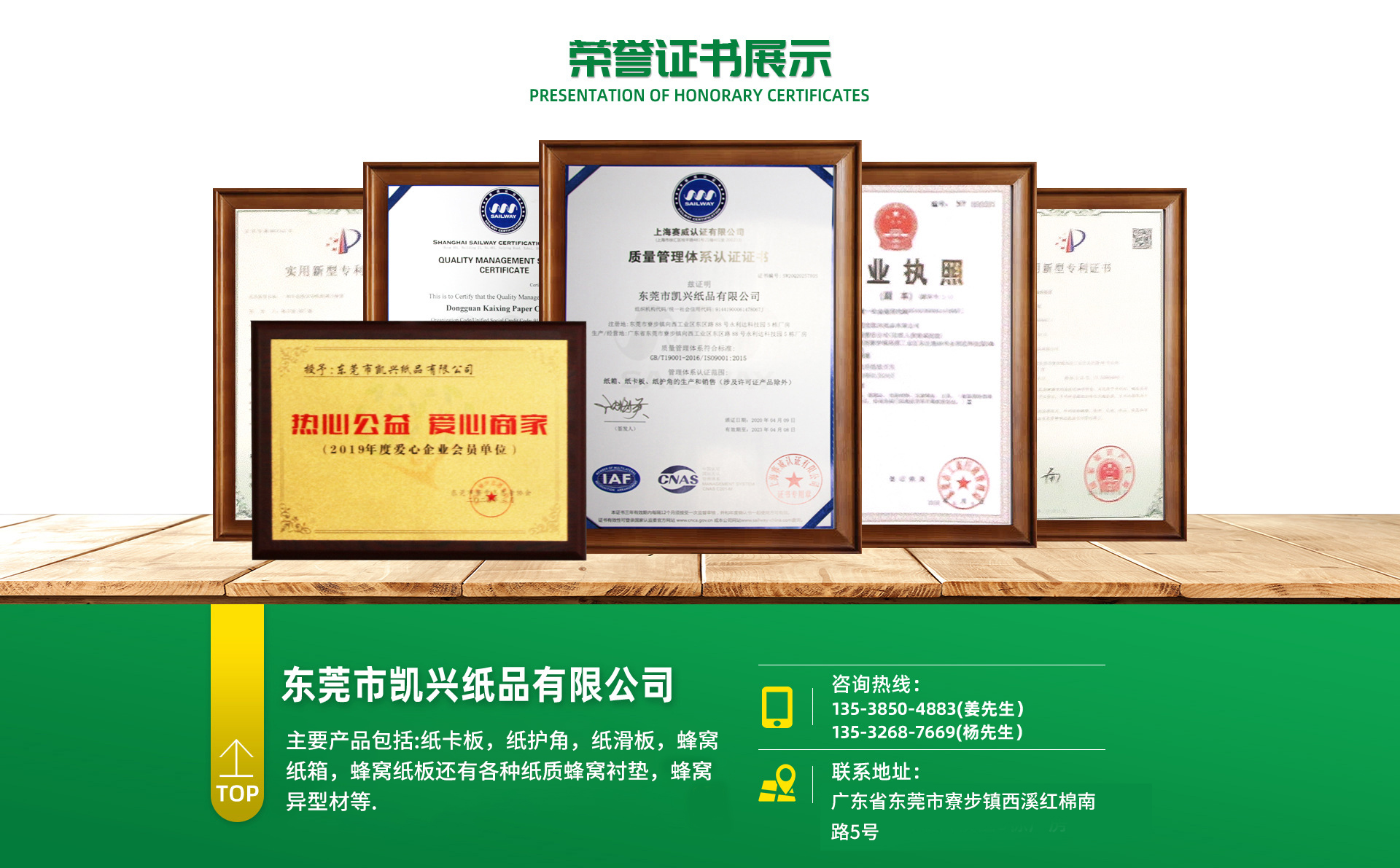 東(dong)莞市凱(kai)興紙(zhi)(zhi)(zhi)品(pin)(pin)(pin)有限公司建立(li)于2008年,是(shi)一(yi)家(jia)專業生產(chan)環保(bao)包裝(zhuang)(zhuang)材(cai)(cai)料的紙(zhi)(zhi)(zhi)品(pin)(pin)(pin)廠,主要(yao)產(chan)品(pin)(pin)(pin)包括(kuo):蜂窩紙(zhi)(zhi)(zhi)板(ban)(ban)(ban)、紙(zhi)(zhi)(zhi)護角(jiao)(jiao)、紙(zhi)(zhi)(zhi)卡板(ban)(ban)(ban)、紙(zhi)(zhi)(zhi)托(tuo)板(ban)(ban)(ban)、蜂窩箱、紙(zhi)(zhi)(zhi)滑板(ban)(ban)(ban),禮品(pin)(pin)(pin)盒,還(huan)有各種紙(zhi)(zhi)(zhi)質(zhi)緩沖襯(chen)墊,蜂窩異型材(cai)(cai)等(deng)。該(gai)材(cai)(cai)料廣泛應用(yong)(yong)于電器、家(jia)具、建筑(zhu)內墻等(deng)行業;所有產(chan)品(pin)(pin)(pin)都是(shi)以(yi)紙(zhi)(zhi)(zhi)為原材(cai)(cai)料制(zhi)作(zuo)而(er)成,是(shi)各種產(chan)品(pin)(pin)(pin)包裝(zhuang)(zhuang)的理(li)(li)想內襯(chen)材(cai)(cai)料,也(ye)是(shi)替(ti)代(EPS)發泡膠最理(li)(li)想的材(cai)(cai)料,該(gai)材(cai)(cai)料成本低廉,又可100%回收利用(yong)(yong),完全符合歐盟ROHS要(yao)求(qiu)。紙(zhi)(zhi)(zhi)護角(jiao)(jiao)代替(ti)木方,角(jiao)(jiao)鐵等(deng)起支撐保(bao)護作(zuo)用(yong)(yong).紙(zhi)(zhi)(zhi)卡板(ban)(ban)(ban),紙(zhi)(zhi)(zhi)托(tuo)盤用(yong)(yong)來代替(ti)木卡板(ban)(ban)(ban)、塑膠棧板(ban)(ban)(ban)出(chu)口裝(zhuang)(zhuang)貨柜使(shi)用(yong)(yong),免熏蒸(zheng),材(cai)(cai)料符合紙(zhi)(zhi)(zhi)卡板(ban)(ban)(ban)行業ROHS環保(bao)標準,取得紙(zhi)(zhi)(zhi)卡板(ban)(ban)(ban)SGS無毒檢測報告(gao)!